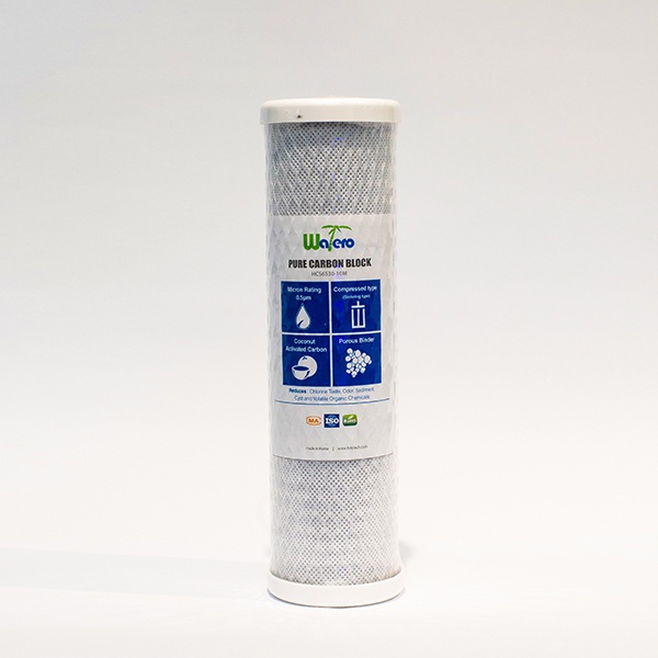 Bộ lọc Pure carbon block với khả năng lọc những chất dơ siêu nhỏ (0.5μm) và lọc được clo dư, mùi, cặn và những hóa chất hữu cơ dễ bay hơi.